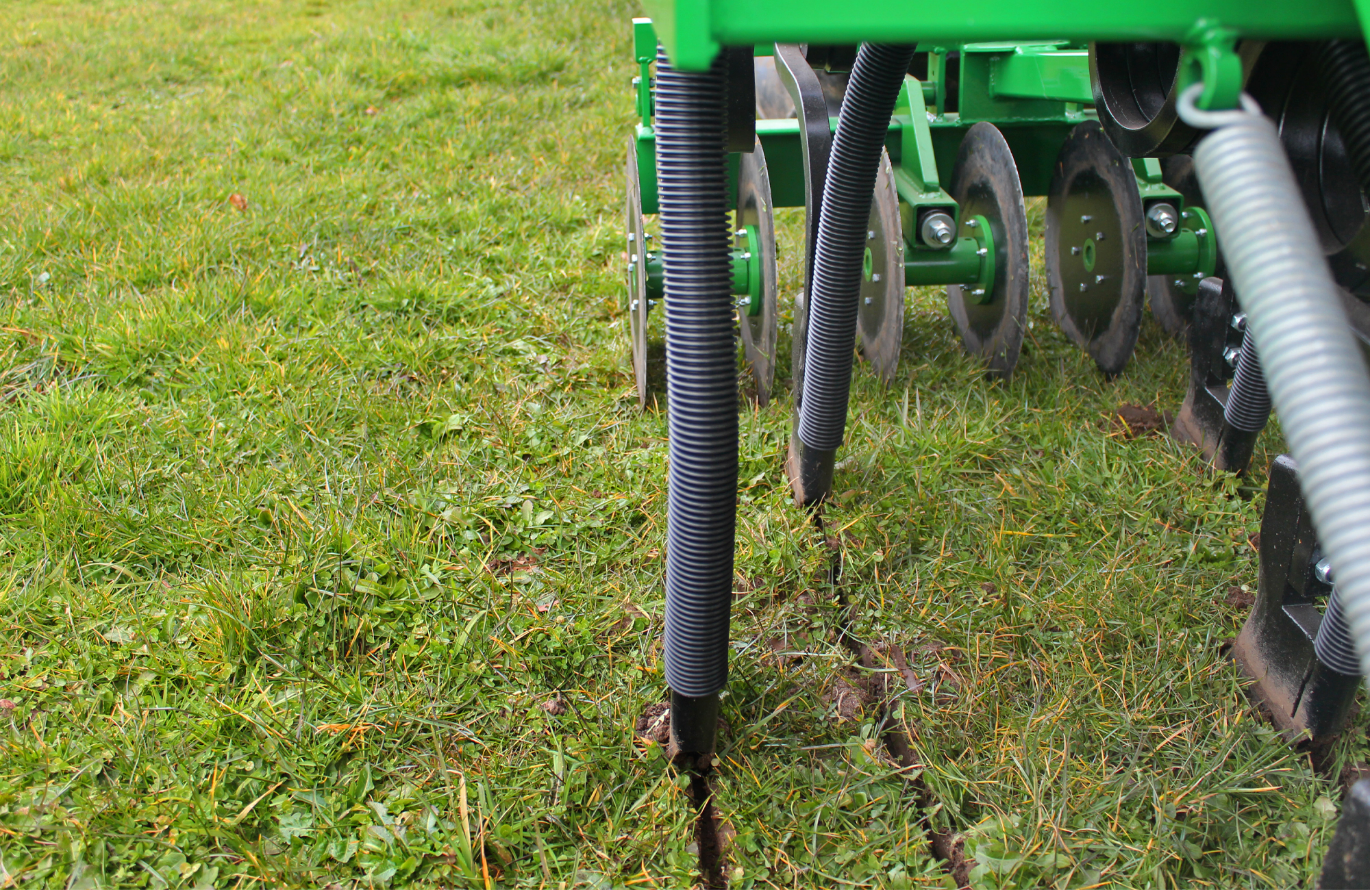 The T-slot coulter creates a 40mm wide opening with a permeable base in which to place the seed. In grassland, growing roots from the existing sward are pruned which allows the newly placed seed to germinate and outcompete the remaining species when stitching in to existing leys. Where the drill is used to establish a new ley or arable crop, the seed is placed in a free-draining, weather-proof micro-environment ideal for germination and early growth (Fig. 1). Consequently, forage and arable crops established using the T-slot system are able to thrive in both dry and wet growing conditions.